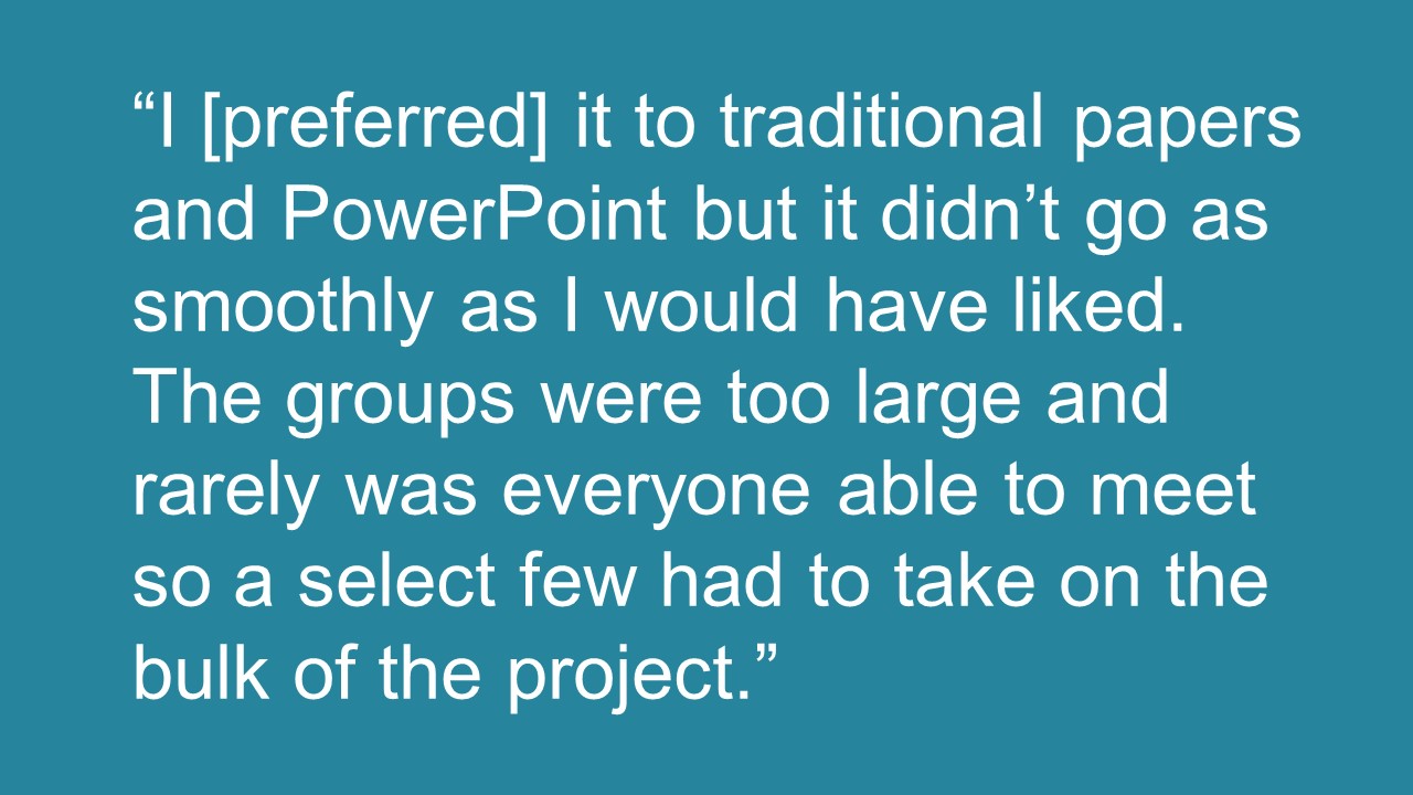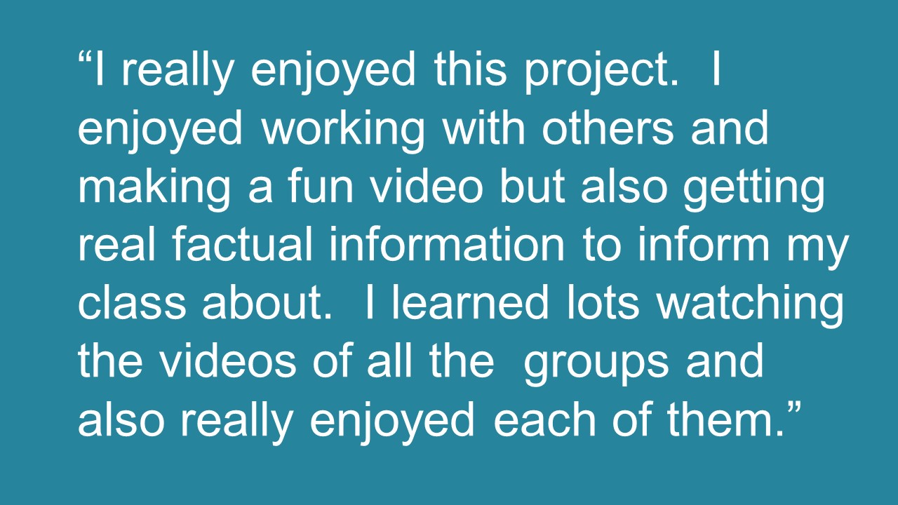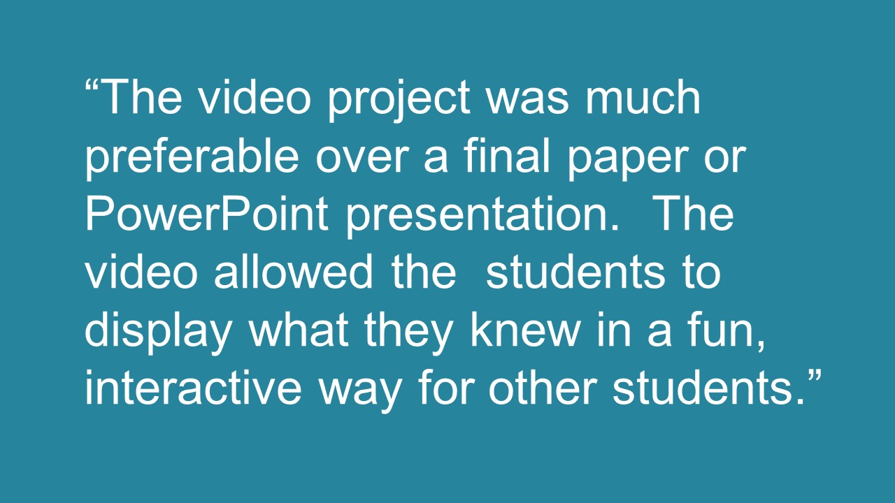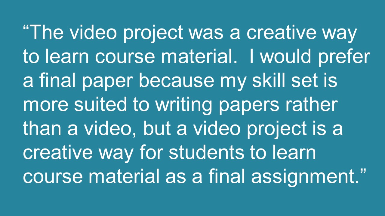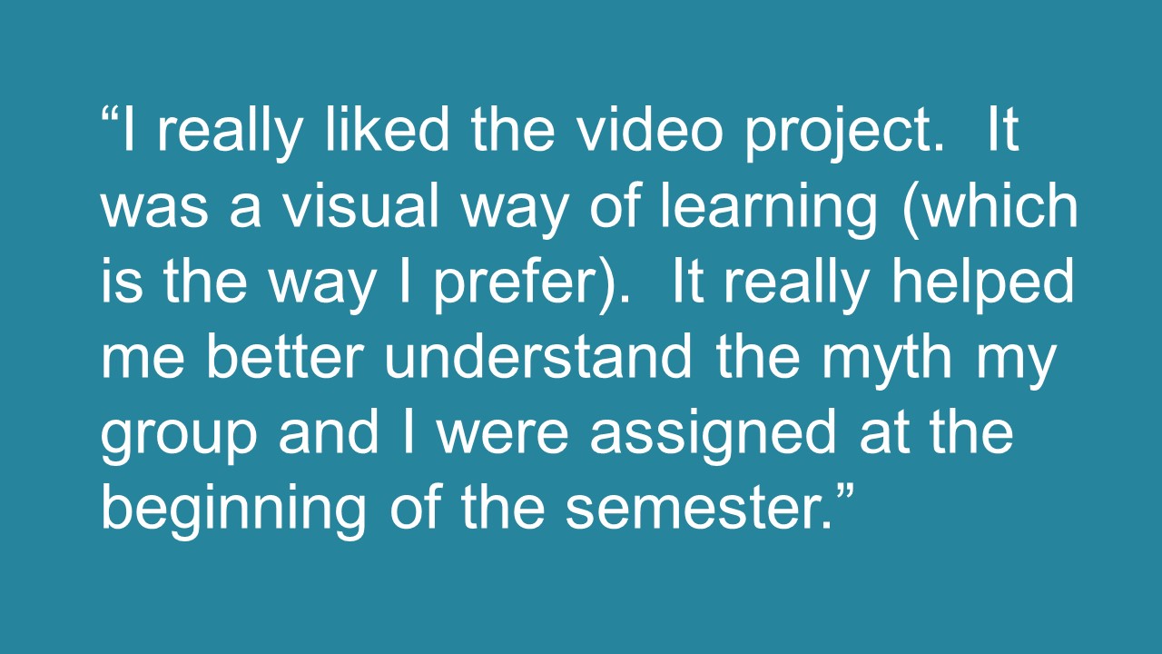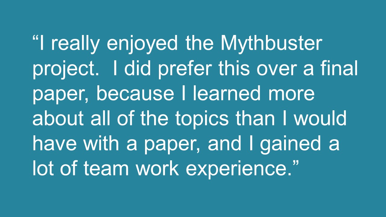 As part of my large-scale Psychology 101 courses, I assign students to work over the course of the semester to “bust” a popular myth about psychology. This project grew out of the need to assign a final project that was manageable for a large class but would still help student develop critical thinking skills. As a bonus, feedback (above) indicates that they enjoy the project more than a traditional group paper or PowerPoint.
